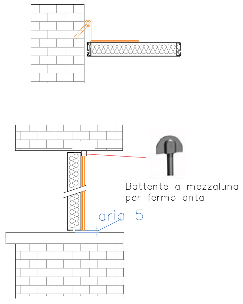 Quest'ultimi fissati sul telaio perimetrale su 3 lati in alluminio in tinta RAL come le Ante, spazzolini perimetrali sulle 2 altezze.