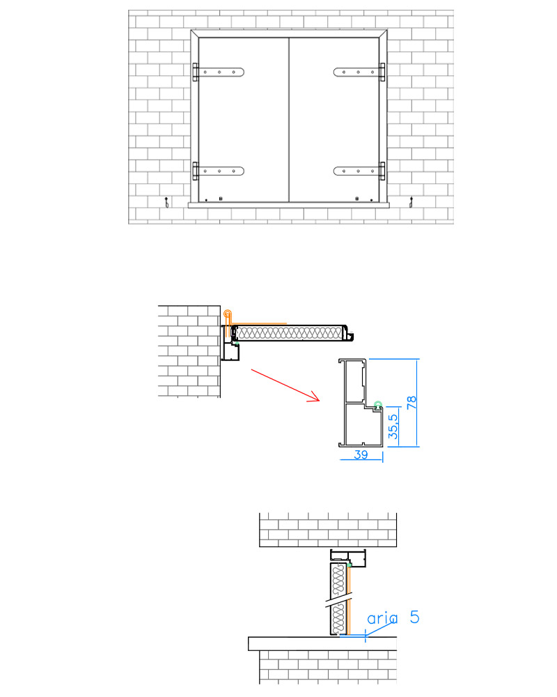 Ante in alluminio di spessore 38 mm formate da due lamiere di spessore 15/10 divise termicamente da un materiale isolante in EPS di sp. 34 mm e da un profilo in PVC estruso di colore Nero/grigio, il tutto incollato con collante poliuretanico elastico.